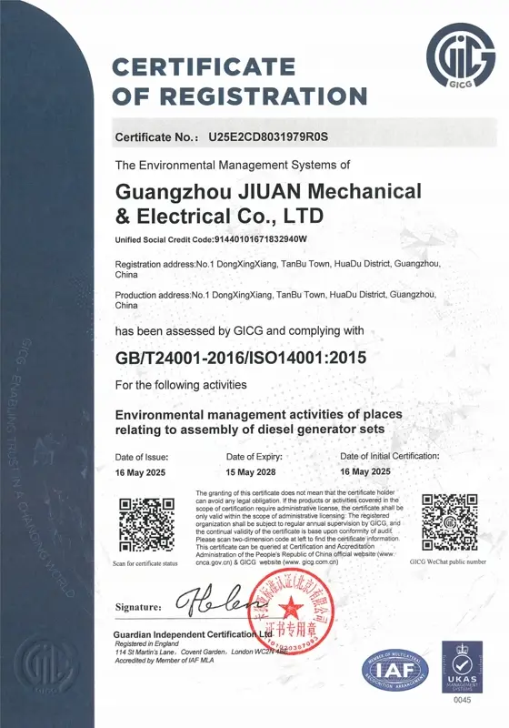 Jiuan est autorisé par les principaux fabricants de moteurs, un gage de notre expertise et de notre crédibilité. Chaque groupe électrogène est fabriqué avec des composants authentiques, traçables, et soumis à des contrôles qualité stricts pour garantir une performance stable et conforme aux normes internationales.